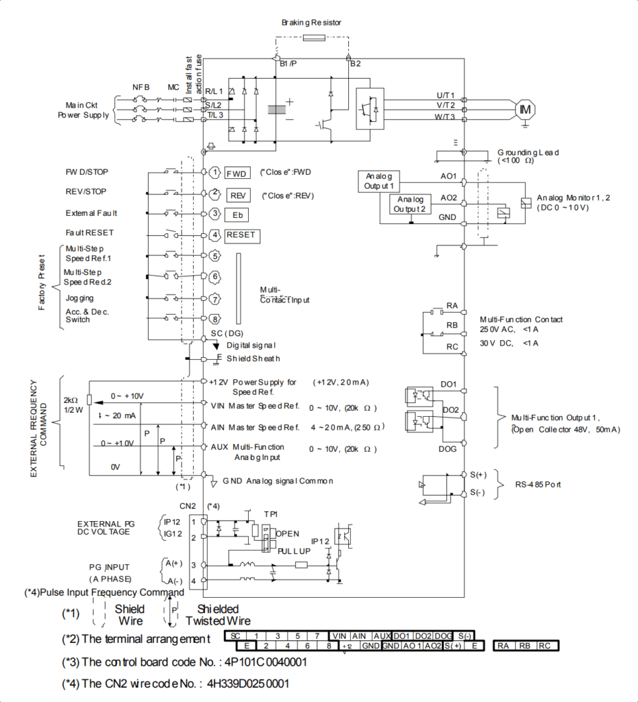 - B1, B2: ترمینالهای مقاومت ترمز خارجی (برای مدلهای بالای 15kW ضروری). از مقاومت ترمز مناسب برای جلوگیری از اضافهولتاژ استفاده کنید.