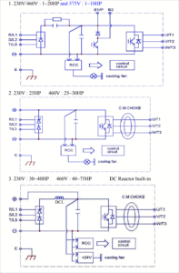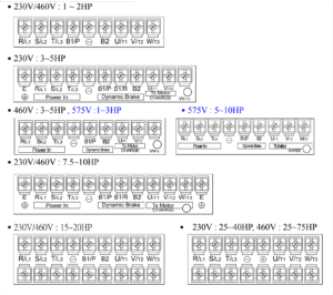 - R/L1, S/L2, T/L3: ورودیهای منبع تغذیه (تکفاز یا سهفاز بسته به مدل). برای مدلهای تکفاز 230V، فقط R/L1 و S/L2 استفاده شود.
