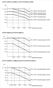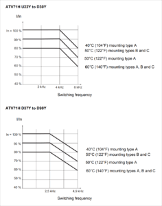 درایوهای ATV71 بسته به دمای محیط، فرکانس سوئیچینگ و نوع نصب ممکن است نیاز به کاهش توان نامی داشته باشند.