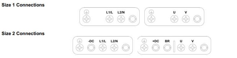 - در سایز ۲، درایو دارای ترانزیستور ترمز دینامیکی است و در صورت نیاز میتوان خرید مقاومت ترمز و اتصال آن به +DC و BR را انجام داد.