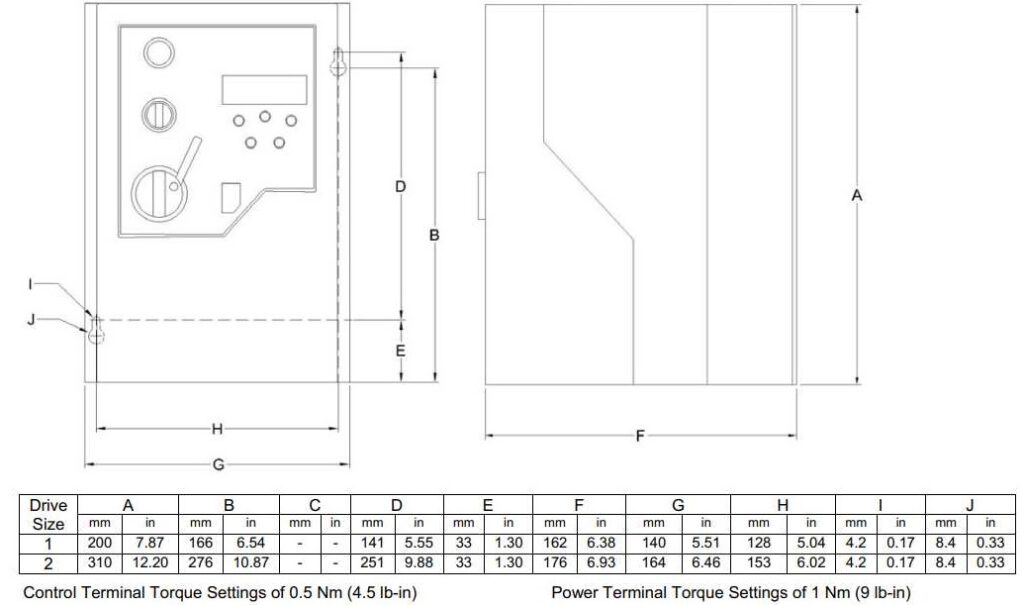 جدول زیر ابعاد دقیق درایوهای Optidrive E2 سایز ۱ و ۲ را نشان میدهد: